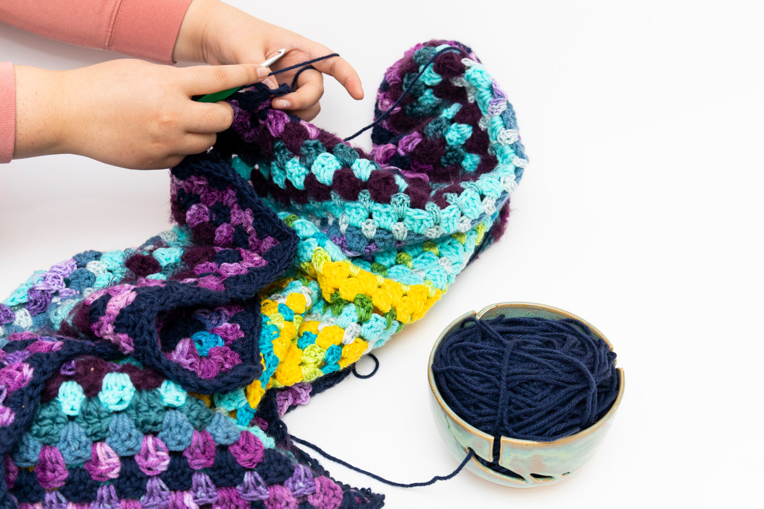 ”Granny Squared.” Press molded and hand built stoneware with underglaze and glaze. 50”x50”. 2021.