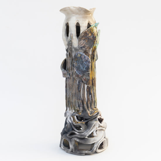 ”Foliage.” Hand built and wheel thrown, raku fired stoneware. 2021.